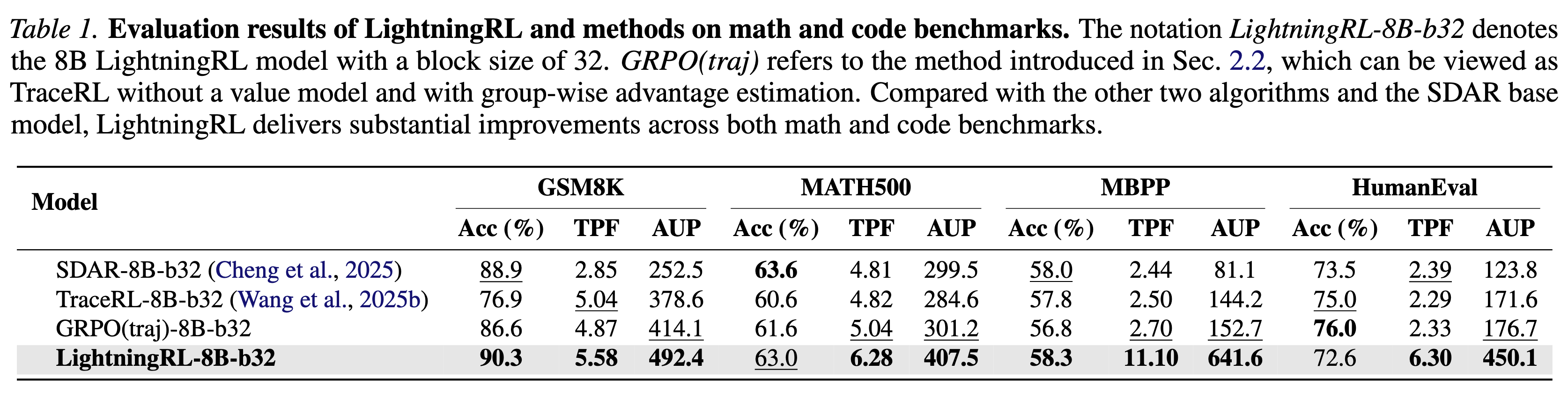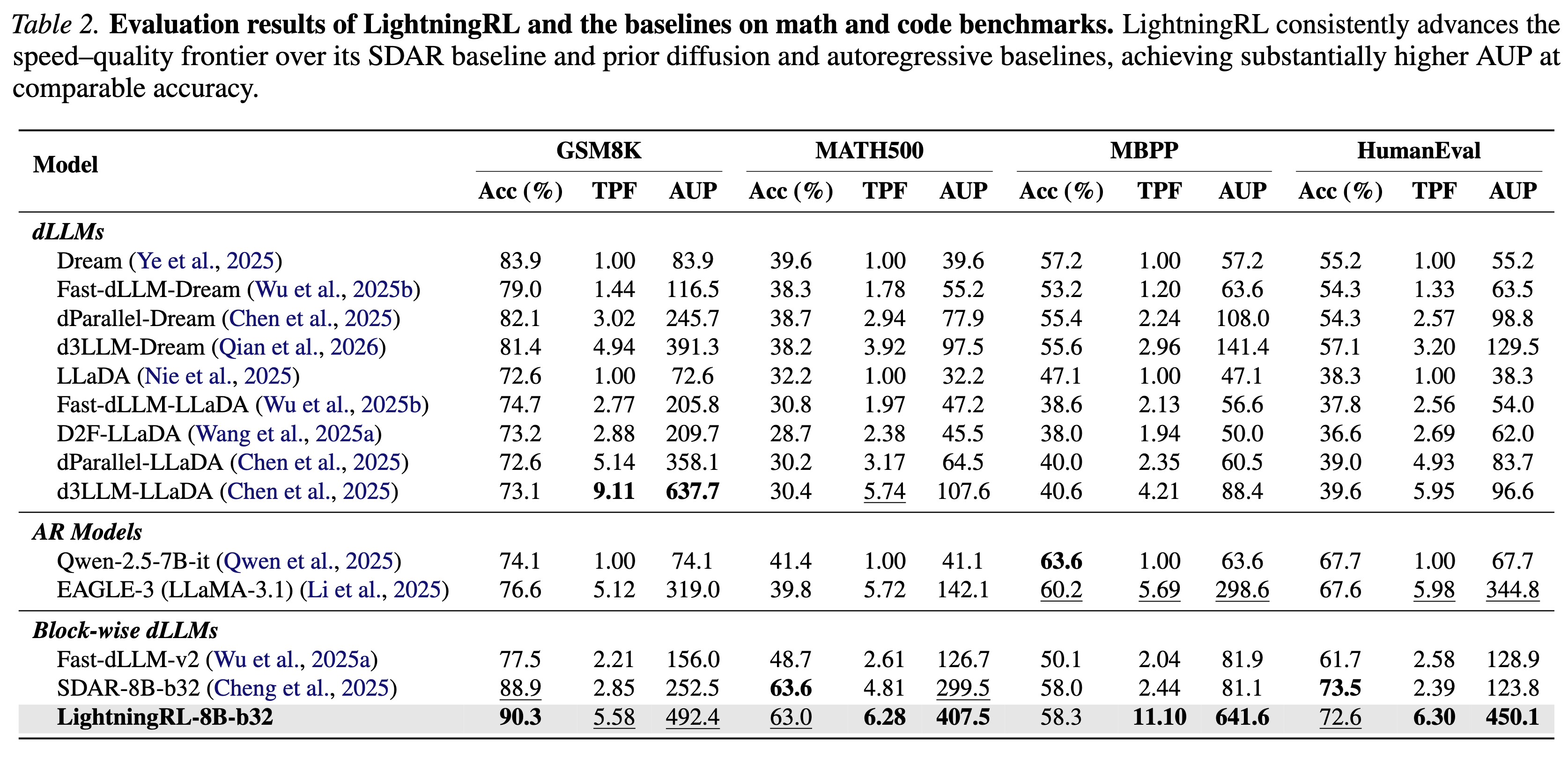 We introduce LightningRL, a reinforcement learning post-training framework for block-wise diffusion Large Language Models (dLLMs) that breaks the accuracy–parallelism trade-off. Applied to SDAR-8B, LightningRL achieves 7.32 average TPF and 497.9 AUP — simultaneously improving both generation quality and inference speed.