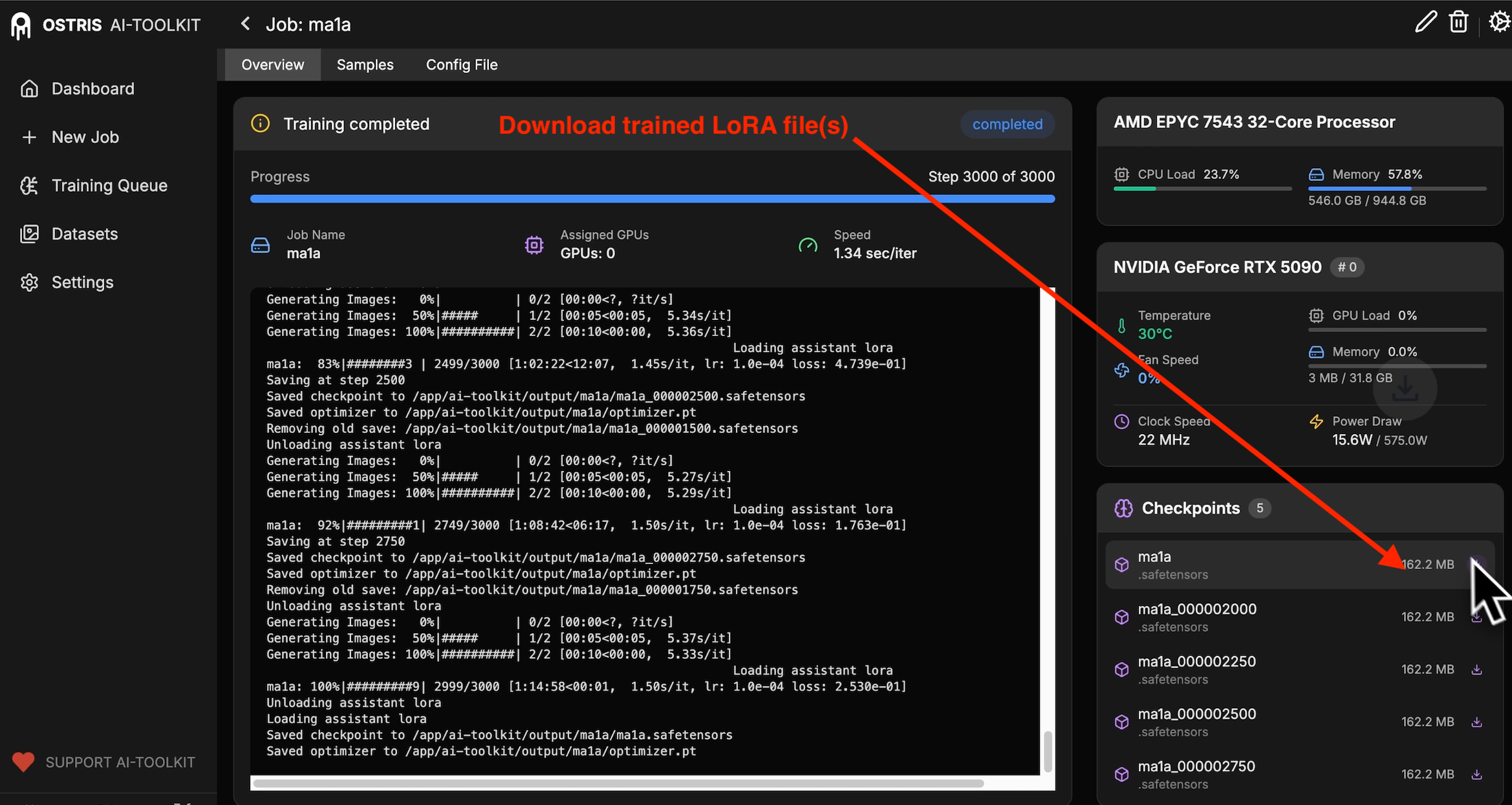 When the run completes, export the latest LoRA checkpoint (.safetensors):