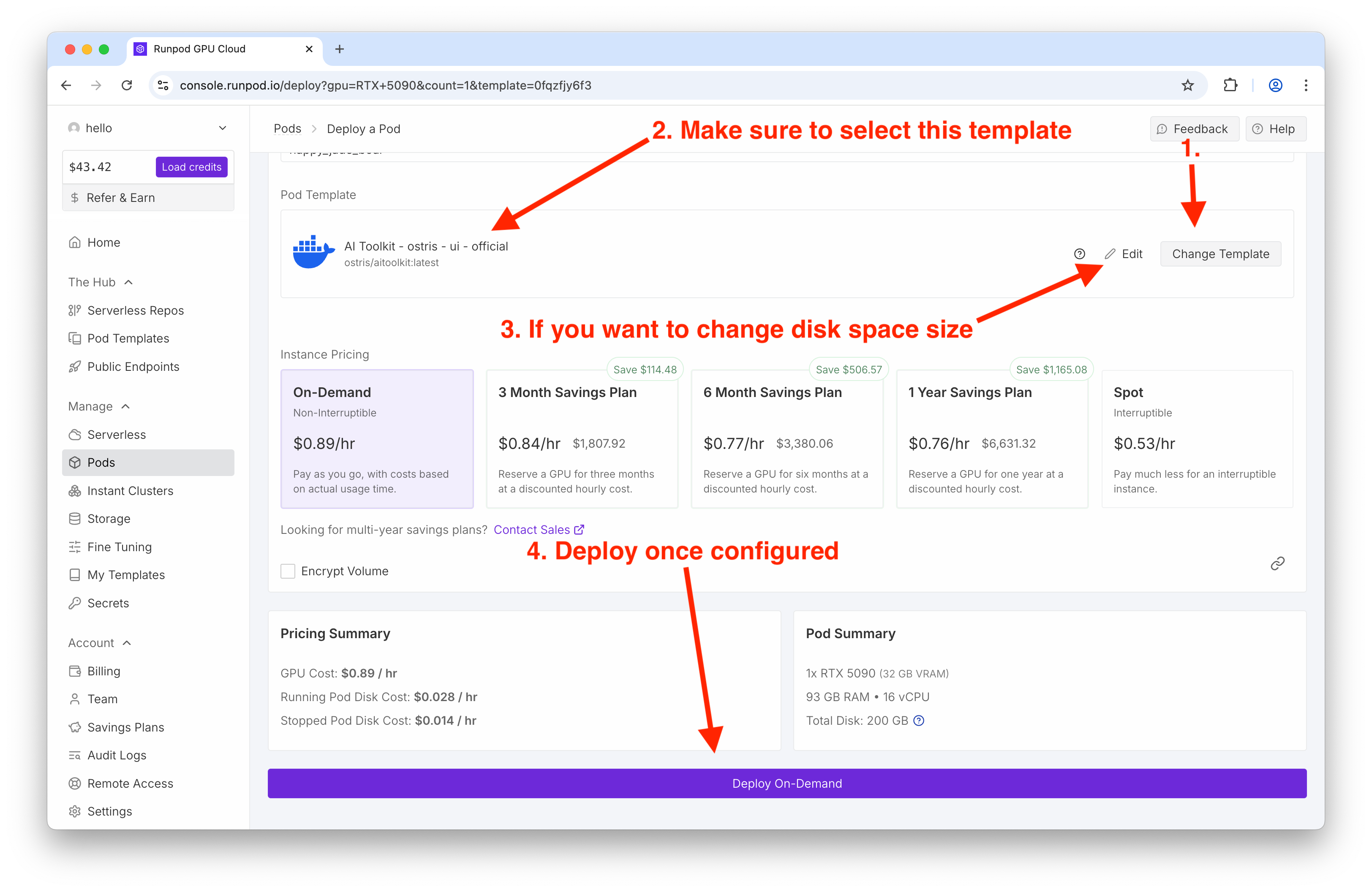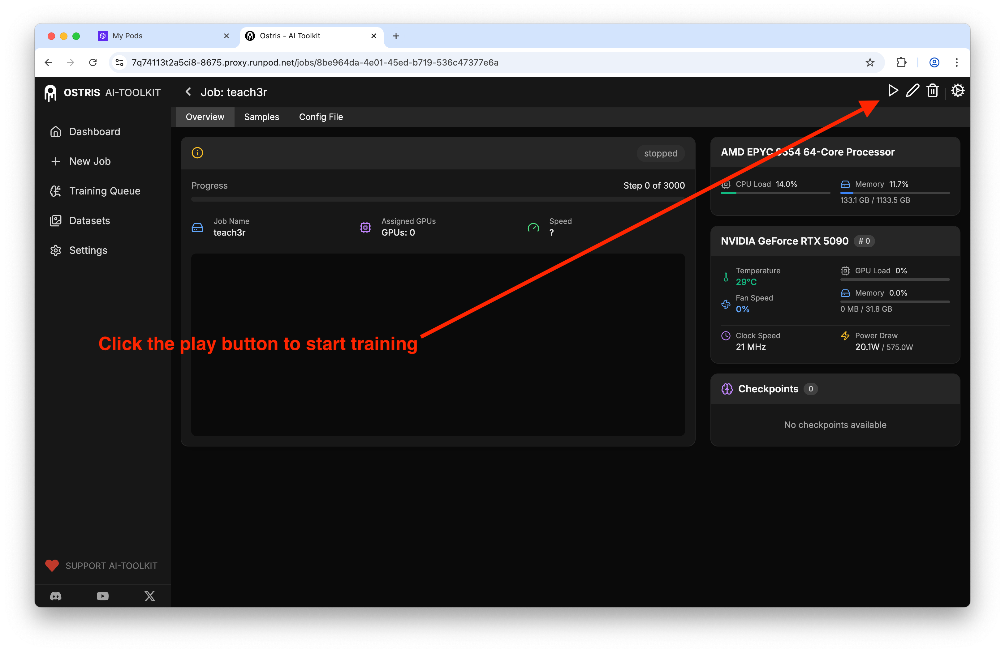 You can spin up a fully prepared environment using RunPod’s Ostris AI Toolkit template. That removes most dependency pinning and driver headaches, and keeps GPU utilization visible during runs.