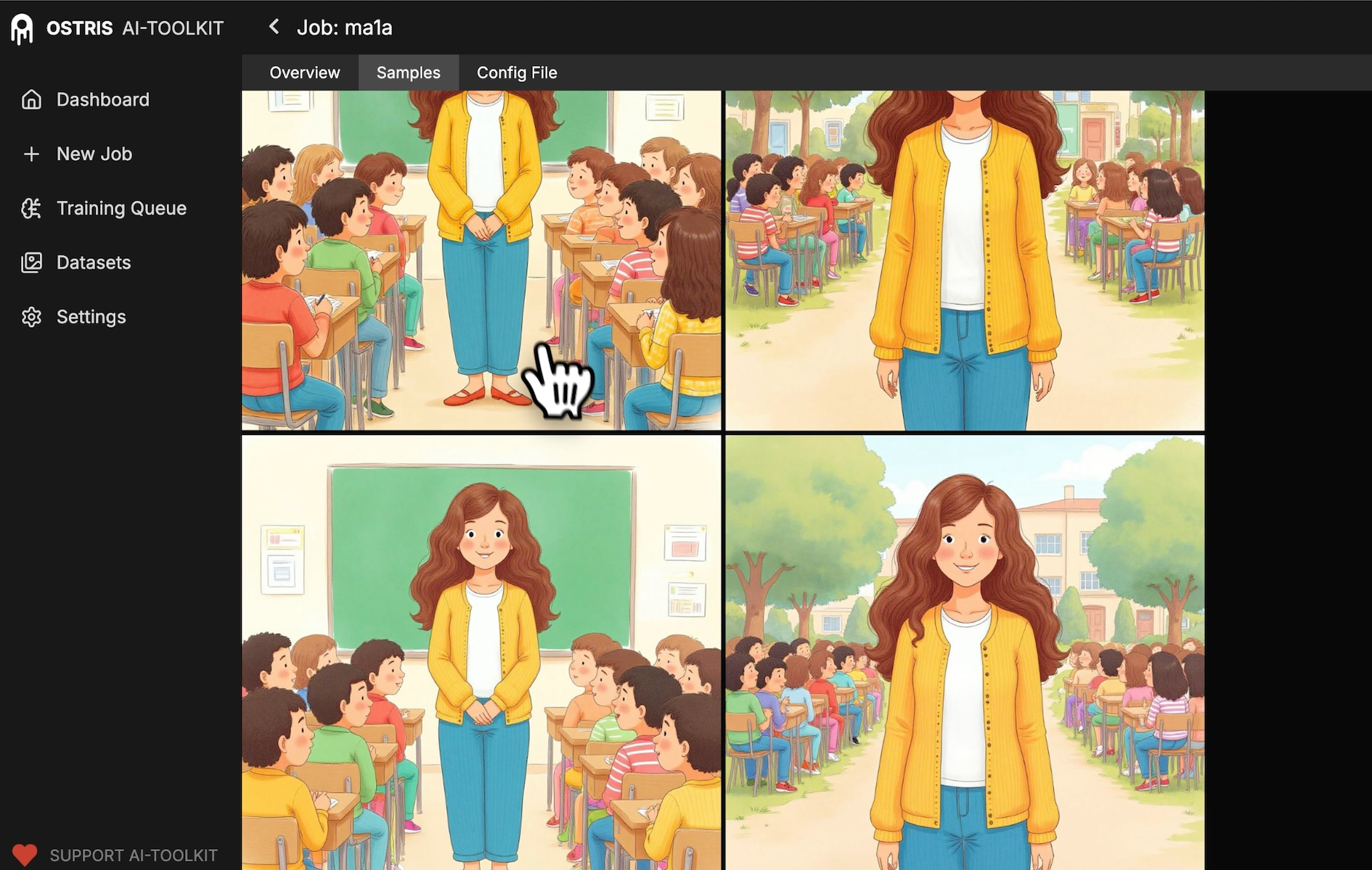 Inspect samples over time to confirm the adapter is learning the identity without collapsing style diversity: