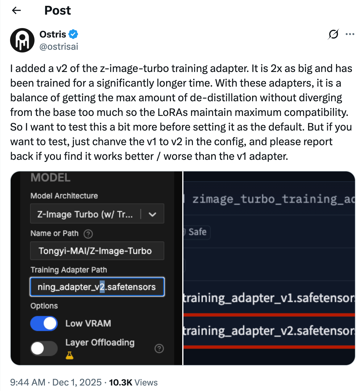 Training adapter: The Ostris toolkit provides a Z-Image Turbo training adapter. Two variants are relevant:
