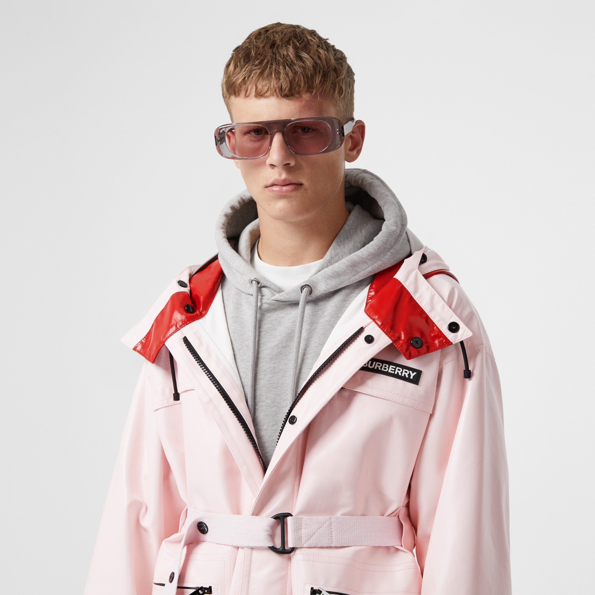 "A man wearing a dark blue camouflage print zip through hoodie with the hood up. He is young, attractive, and has a big nose, big lips, brown hair, with straight hair."