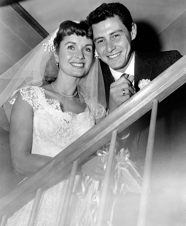 "<div class='meta'><div class='origin-logo' data-origin='AP'></div><span class='caption-text' data-credit='AP Photo/Marty Lederhandler'>Actress Debbie Reynolds and singer Eddie Fisher smile in a pose following their brief marriage ceremony by a county judge at Grossinger, N.Y. on Sept. 26, 1955.</span></div>"