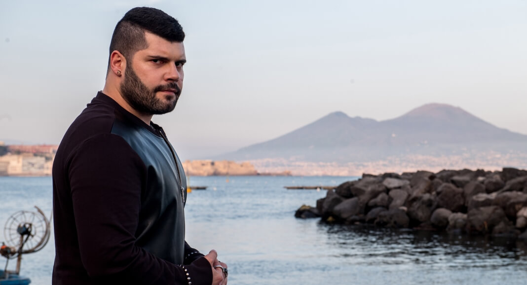"The person in the picture is a young man wearing a black and red hoodie. He is standing in front of a white background, which could be a wall or a similar flat surface."